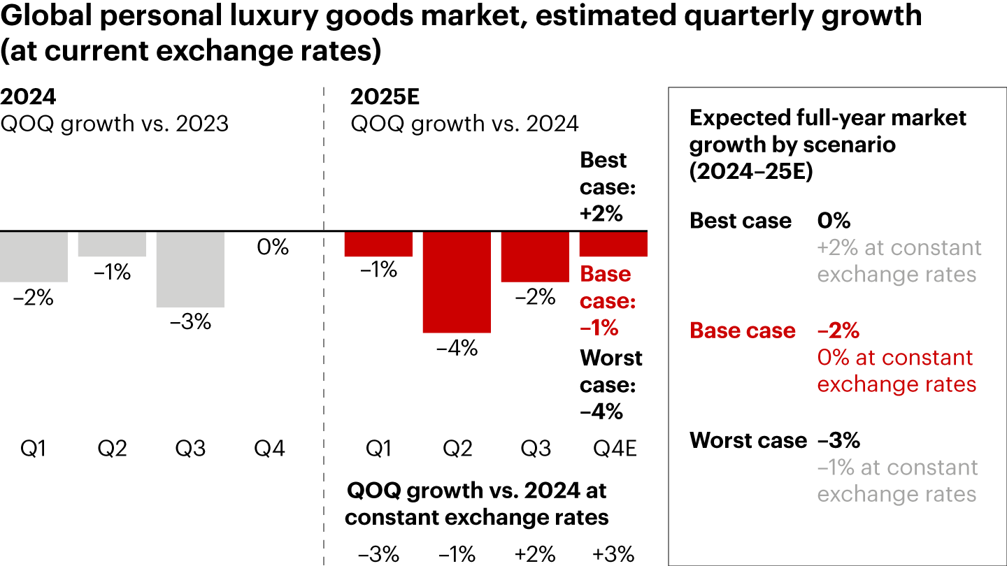 The market for personal luxury goods—at the heart of both the luxury industry and this analysis—held relatively steady against a backdrop of macroeconomic uncertainty and sustained price elevation. After reaching €364 billion in 2024, sales of personal luxury goods are forecast to total €358 billion in 2025, reflecting a mild 2% erosion that would equate to a flat performance at constant exchange rates. The second half of the year saw a sequential improvement in market trajectory.