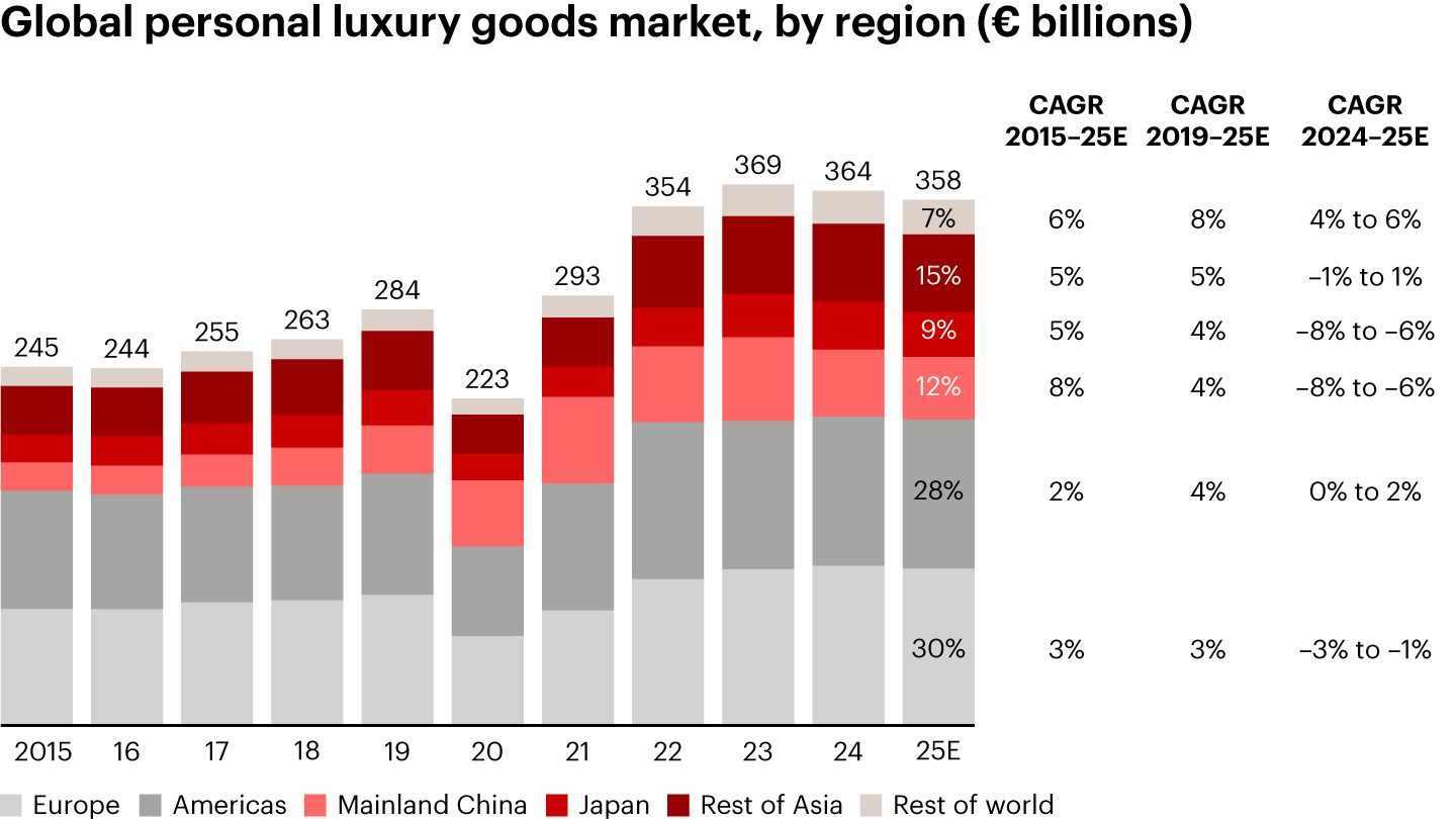- Europe remained the largest market globally for personal luxury goods, despite a slight contraction in 2025. The Americas held its position as the second-largest region and stood out as the most resilient this year. Mainland China recorded another significant decline—though less pronounced than in 2024—but maintained its third-place ranking. Japan also saw a marked correction following its 2024 record.