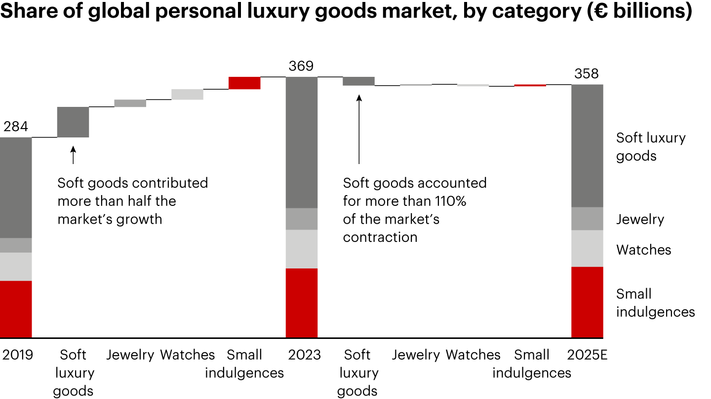 Notes: Growth shown at current exchange rates; E indicates estimated value; soft luxury goods include apparel, leather and shoes; small indulgences include beauty, eyewear, and other accessories