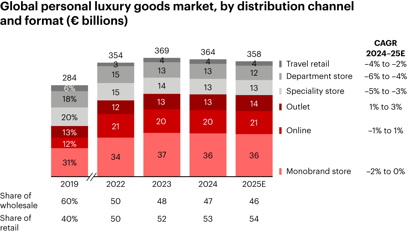 - Monobrand store sales declined by an estimated –2% to 0% at current exchange rates, reflecting subdued footfall. Amid pressure on cash flows, brands took a conservative approach to their store footprint. Closures included the loss of about 25,000 square meters of monobrand space since January. In the first 11 months of 2025, the number of monobrand store openings was 15% to 20% lower than in the corresponding period of 2022, although the new locations were significantly larger as average flagship store size increased by more than 30%. The monobrand model needs a strategic reframing. Rising customer expectations are increasing the cost to serve. Within a typical city, consumers are becoming more fragmented in their needs and behavior. Alternative purchase options are multiplying, too. Reenergizing the store and customer engagement will require investment in hyper-personalization beyond traditional clienteling, more localized and store-level assortment strategies, and deeper human connections that extend beyond transactions.