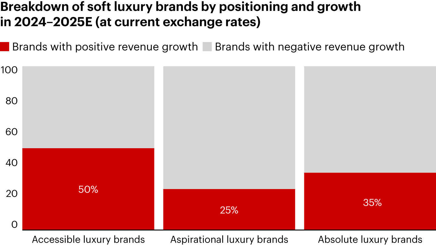 - After several years of price elevation across the sector, accessible brands emerged as the strongest performers in soft luxury, with roughly 50% of these brands managing to grow in 2025, compared with about 25% of aspirational brands and 35% of absolute luxury players, highlighting tightening price elasticity as consumers become more discerning.