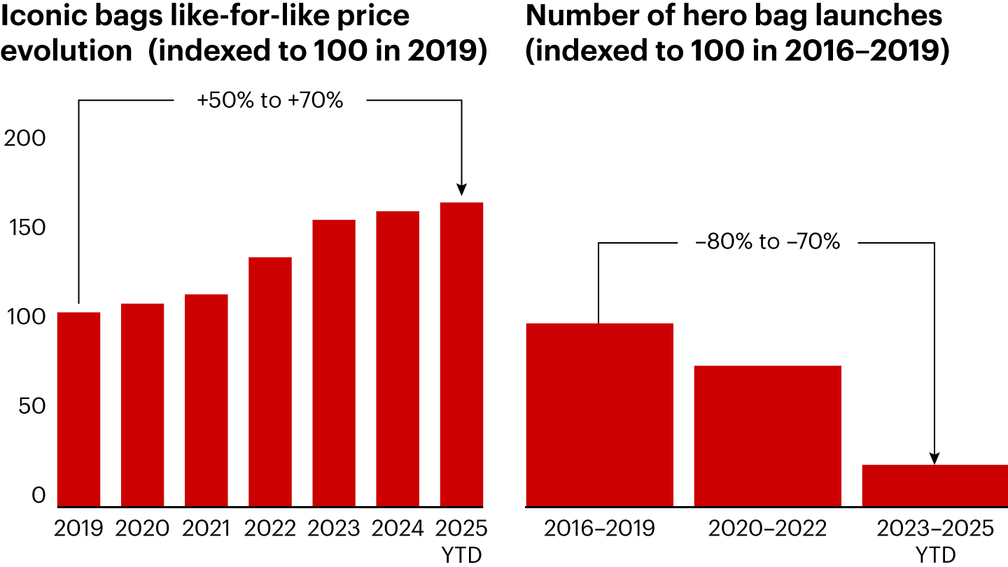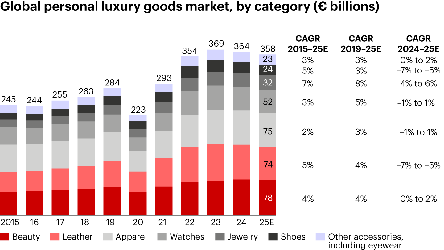- Leather goods declined again in 2025, down an estimated 5% to 7% at current exchange rates to about €74 billion. The category continues to feel the effects of substantial price increases since 2019 and a consumer perception that the price-to-value equation has broken. The prices of like-for-like iconic bags have risen by between 50% and 70% from 2019 to 2025. That’s happened in conjunction with a sharp drop in product innovation, with 70% to 80% fewer hero-bag launches occurring during the period from 2023 to 2025 compared to the period from 2016 to 2019. The perceived lack of freshness has sparked demand for new and more playful alternatives, particularly among Gen Z. As a result, leather goods remain highly exposed to volatility, with aspirational consumers being increasingly drawn to insurgent brands offering sharper value propositions.