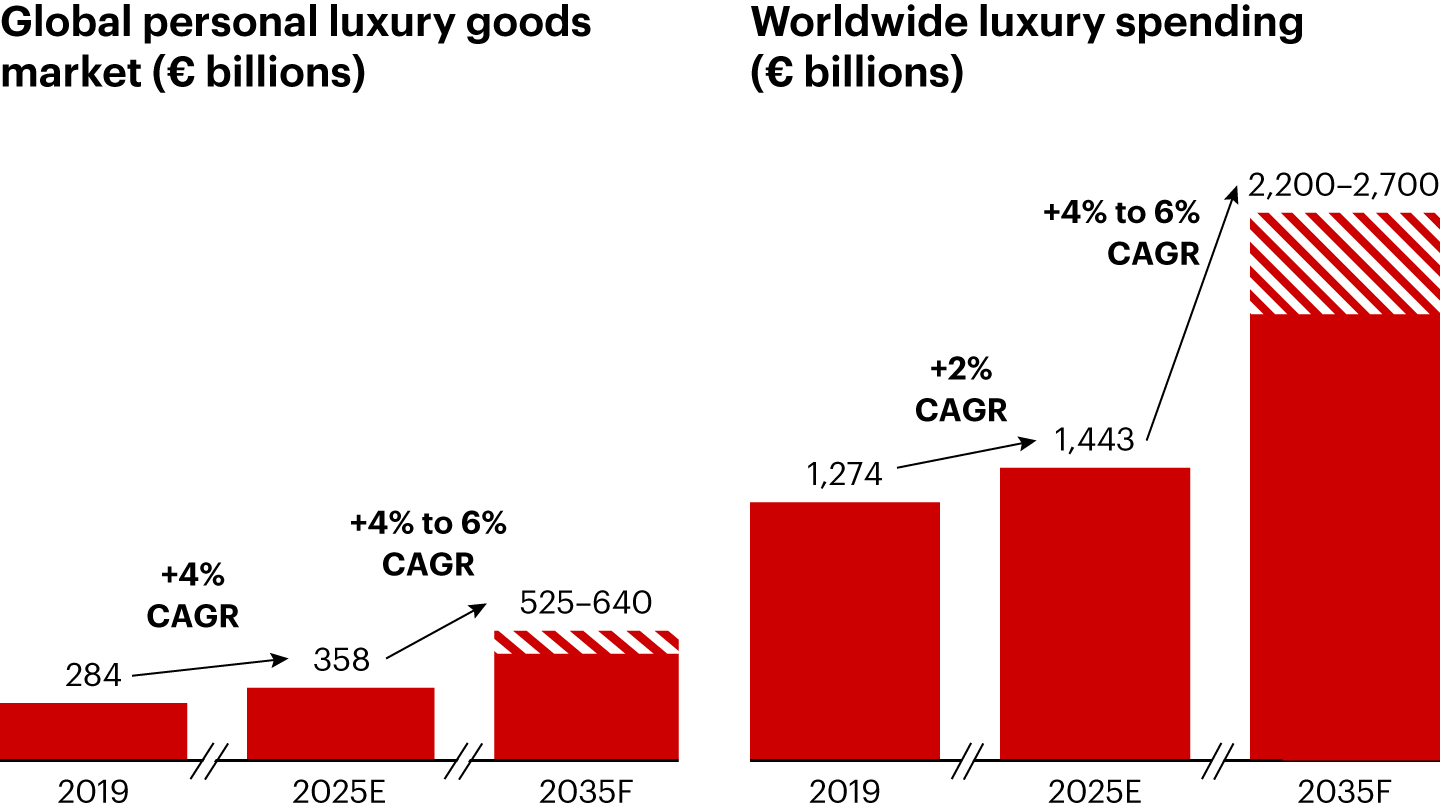 - Over the next decade, we expect overall luxury spending (including goods and experiences) to experience solid growth of 4% to 6% per annum, rising to an estimated €2.2 trillion to €2.7 trillion in 2035.