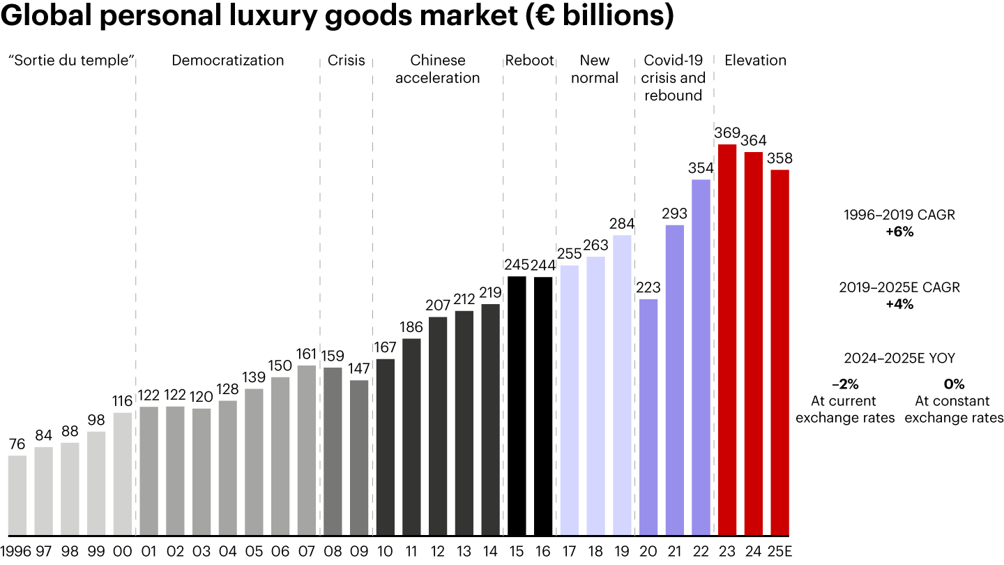 - As the industry moves beyond its elevation phase, the defining traits of the next era of luxury remain an open question. The coming chapter could be shaped by a renewed emphasis on ethics and responsibility or, conversely, by a return to heightened exclusivity. The outcome will ultimately hinge on the active choices brands make. Staying relevant will require brands to strategically reimagine the playbook to capitalize on the growing base of potential consumers. This will mean making clear choices about whom to serve; returning to the essence of this industry by reinjecting creativity, quality, and purpose as non-negotiable pillars of the value proposition; investing decisively in the elements that truly differentiate the brand; embedding precision and excellence in execution; and, ultimately, building the talent base needed to thrive in the years ahead.