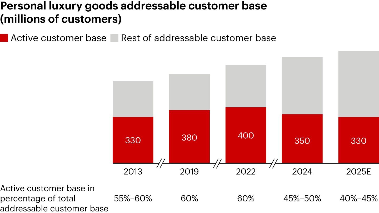 - Last year was the first time in 23 years of our tracking the industry that the luxury market lost customers. Unfortunately, that trend has continued. About 20 million consumers exited the market in 2025, bringing the global active client base to around 330 million, down from 400 million in 2022, effectively returning to its 2013 estimated size. This contraction is striking given that the overall addressable luxury market has expanded steadily from 2013. As a result, the share of addressable consumers who are active buyers is shrinking: Only 40% to 45% of the total addressable consumer base purchased personal luxury goods in 2025, compared to around 60% in 2022. Brand-level data mirrors this dynamic, with new client recruitment down about 5% vs. 2024.