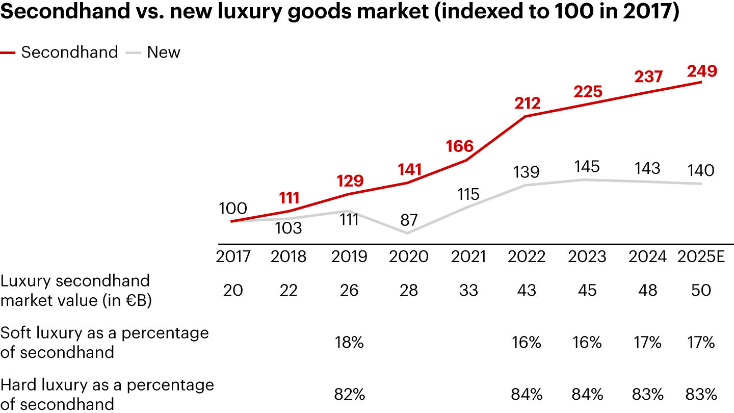Meanwhile, secondhand luxury goods sales grew to an estimated €50 billion, rising by 4% to 6%, outpacing sales of new luxury goods. The segment delivered strong results across categories in both hard and soft luxury.