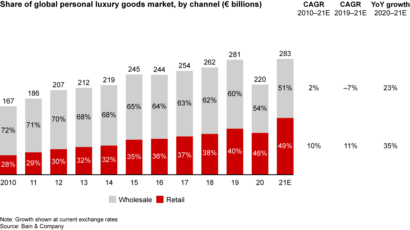 Brands continued to increase control over their distribution in 2021, with a rise of directly operated channels. The retail channel has grown to the point that it now accounts for almost half the market (a forecast 49% in 2021) and is poised to overtake the wholesale channel.