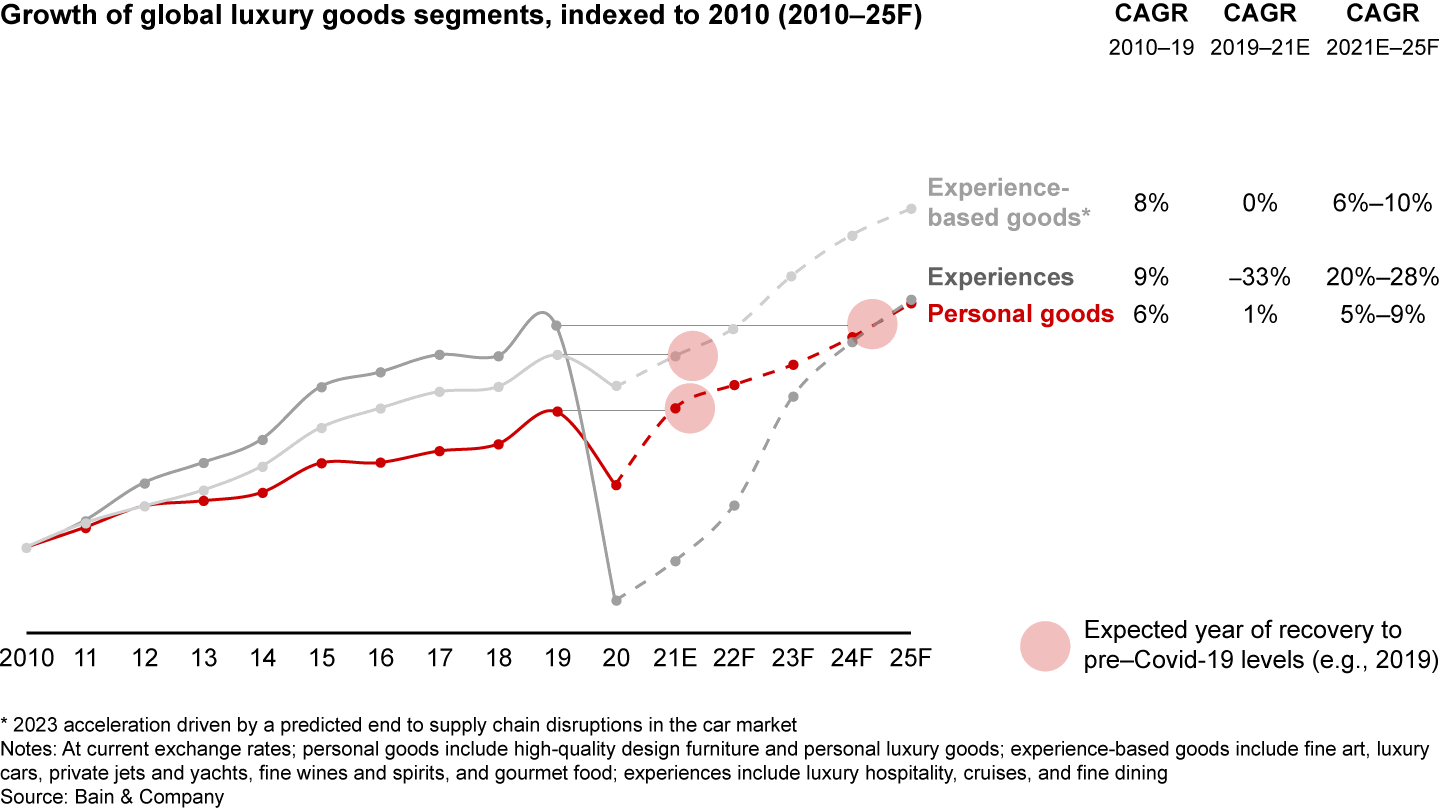- The prompt 2021 rebound suggests that growth will be healthy for the personal luxury goods market in the medium term. We expect the sales recovery to continue over the next four years, with the personal luxury goods market reverting to annual growth rates between 6% and 8% until 2025.