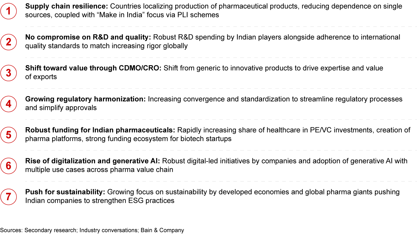 Seven major market trends play into India’s quest to become a global pharmaceutical export hub (see Figure 3). These trends have the potential to strengthen India’s standing in the global market and enhance its reputation as a reliable and innovative supplier.