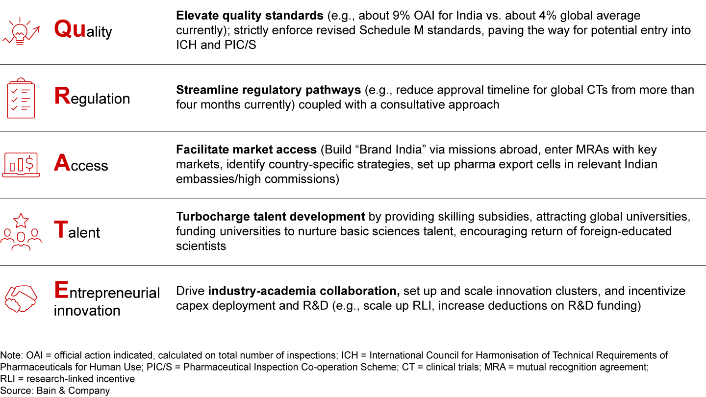 Alongside the key imperatives detailed for the private sector, strong policy support from the government is also important to ensure that Indian pharmaceutical players get the regulatory support and investment incentives that will help them grow their exports. The recent adoption of Schedule M, akin to WHO GMP standards, is a welcome start. India needs to continue efforts to become part of PIC/S and be counted among the regulatory bodies with best-in-class standards. Specifically, government entities should consider taking the following steps: