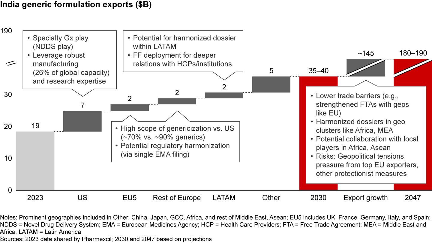 A geographic cluster approach (e.g., US, EU5, LATAM) is crucial to identify where India can increase generics exports. By aggregating these efforts, India is poised to double its generic exports to $35 billion to $40 billion by 2030, and with targeted efforts within each geographic cluster, could reach $180 billion to $190 billion by 2047 (see Figure 9).