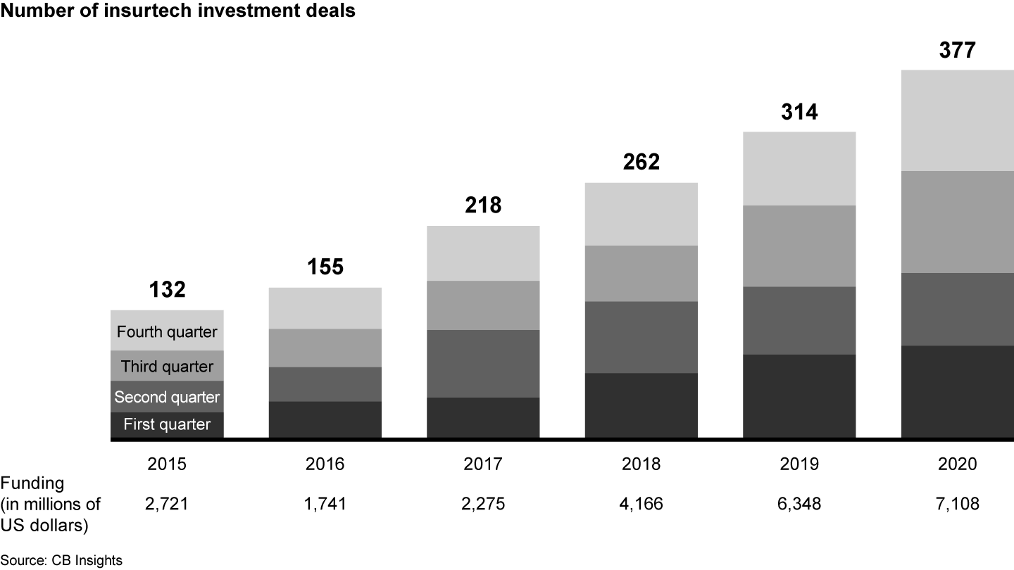 Insurtechs are continuing to get more attention and funding than ever before from traditional insurers and other investors. Investments totaled more than $7 billion compared with $6.3 billion in 2019 (see Figure).