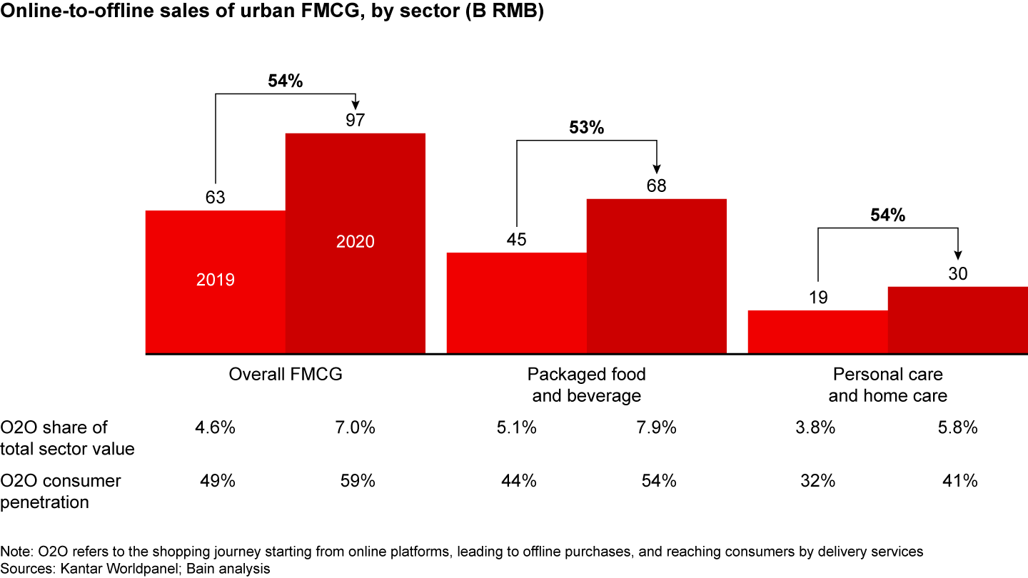 Covid-19 has been a boon to O2O channels, and its impact seems to be long-lasting. In large numbers, locked-down consumers who turned to O2O for FMCG purchases are staying. As a sign of its stickiness, the O2O retention rate between the first half of 2020, when many consumers were stuck at home, and the second half of the year was 53%. In the first quarter of 2021, the penetration rate was 38%, not much lower than 41% a year earlier, when O2O was one of the few options available.