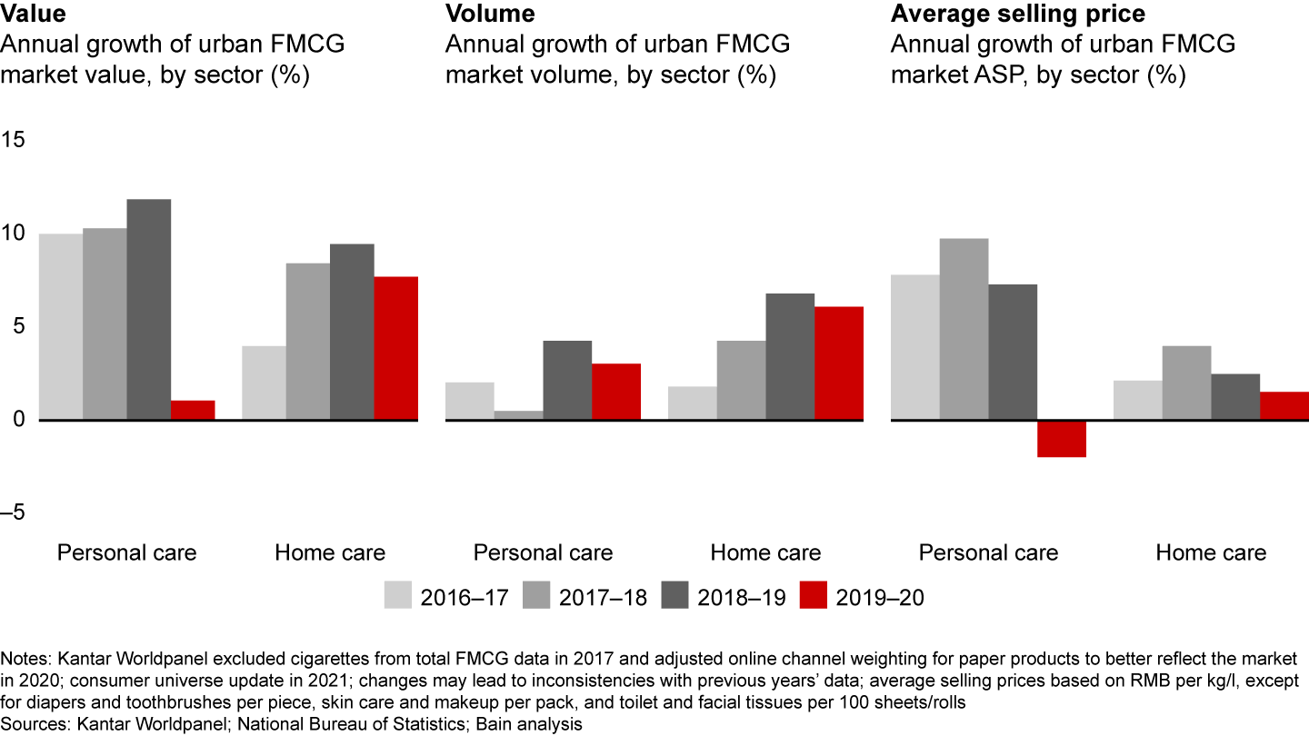 With FMCG prices rising slower than inflation, volume gains—not prices—contributed the most to overall value growth in China. Increased frequency of shopping trips played a role in the volume growth, too. But to understand the hefty impact of price deflation, consider that the 1% ASP decline in 2020 resulted in an actual 3.5% decline when inflation is factored in.