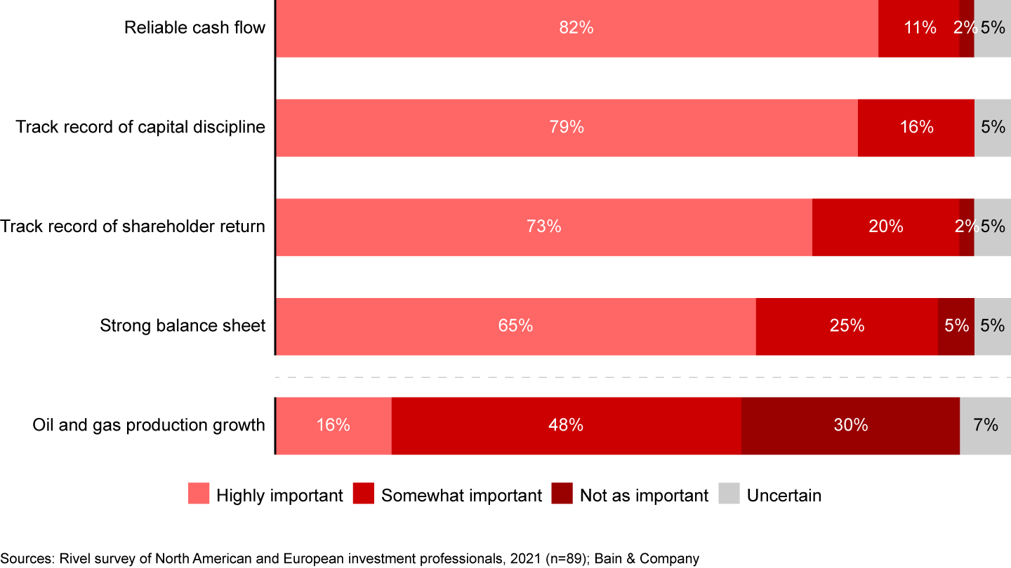 In this dynamic environment, three core messages emerged from our discussions with investors and analysts that should have long-term resonance for oil and gas executive teams. First, investors and analysts are clearly looking for oil and gas executive teams to remain focused on cash generation and maintain disciplined deployment of capital. Of the 10 factors we tested in our conversations, oil and gas production growth was the least important factor determining investment decisions (see Figure 3).
