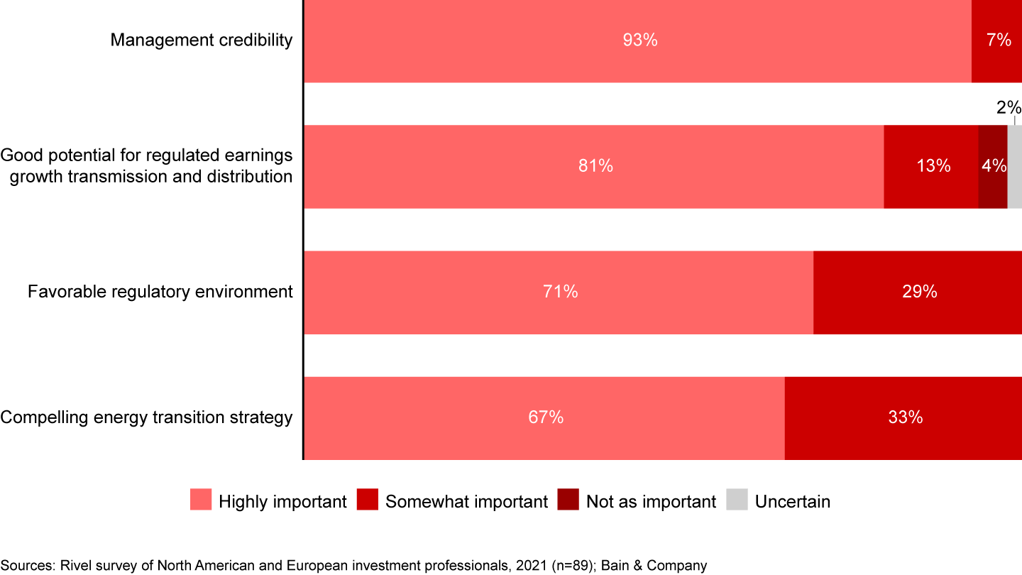The investors we interviewed believe in the utility sector and the stability of the utility model (see Figure 2). The most commonly cited factor determining investment decisions is management credibility (93%).