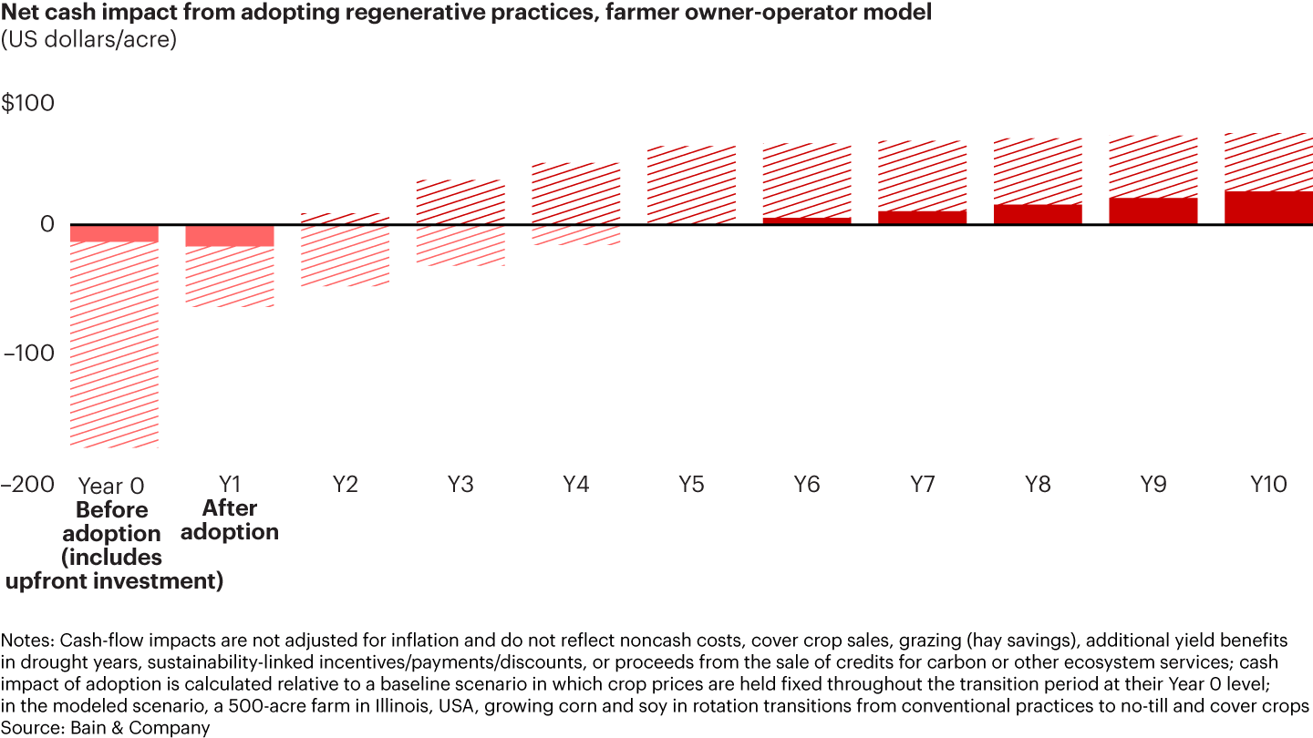 Regenerative agriculture, one part of that transformation, illustrates the challenge. Its potential benefits are well understood, but farmer adoption has not scaled quickly enough due to economic, technical, and social barriers. Even though longer-term returns can be positive, the economic risks farmers face in the early transition years—up-front investments required, uncertainty in yields as soils are reconditioned—can pose a major barrier to getting started at all (see Figure 1).
