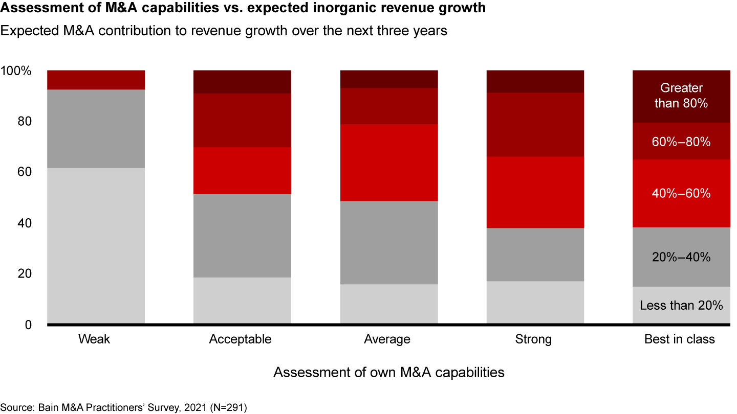 As companies rewrite their corporate strategies for the post–Covid-19 world, M&A will gain further prominence. In fact, the M&A practitioners we surveyed expect M&A to account for nearly half of revenue growth over the next three years—that’s up from 30% over the past three years. What’s more telling is that practitioners with higher confidence in their firms’ M&A capabilities expect M&A to contribute to a higher share of revenue growth (see Figure 1).