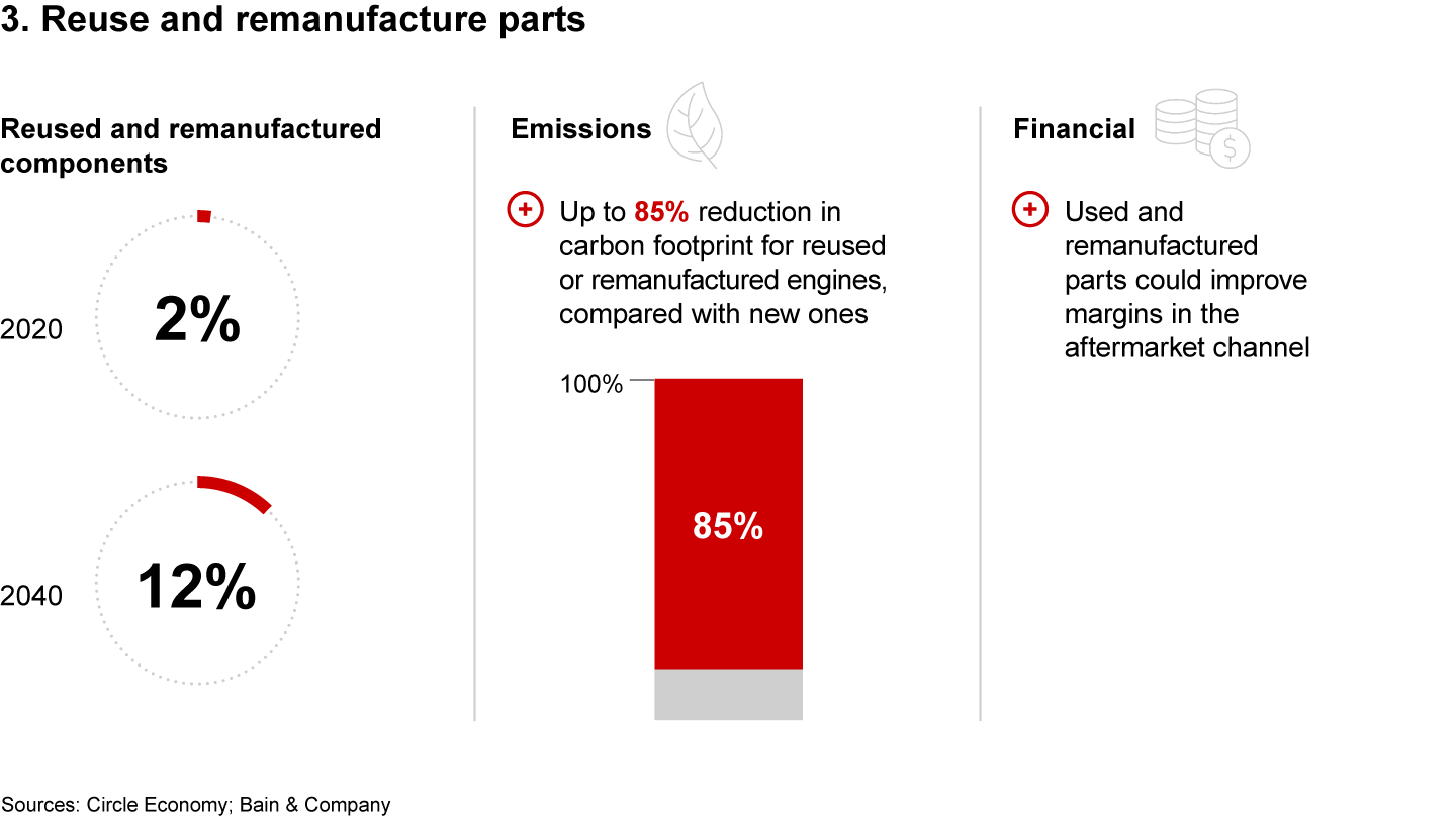 There is also potential in using recycled materials and components in repairs. In 2020, only 2% of the parts used for auto repairs in Europe were recycled; raising that to 12% by 2040 could reduce emissions and increase profit margins (see Figure 2). Refurbishing an existing engine requires only about 15% of the emissions that it takes to make a new one.