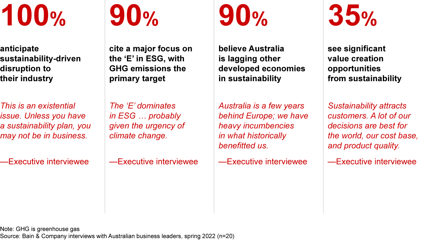 - The sustainability value-creation opportunity is still a minority mindset. One-third of interviewees see significant value-creation opportunities from sustainability beyond risk mitigation. These leaders are using sustainability as a basis to transform their organisations and capture benefits such as access to new profit pools, lower costs, and better equity valuations.