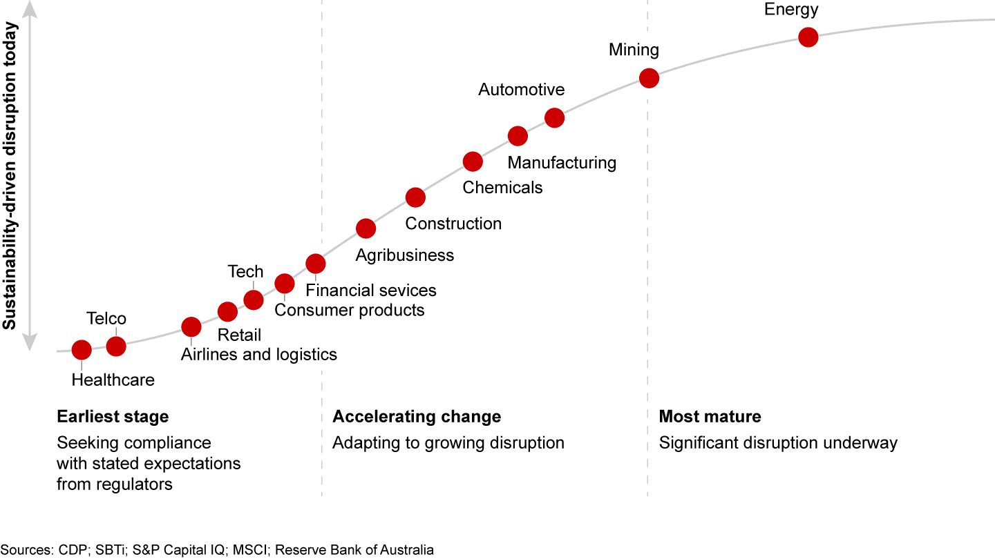 Every executive interviewed for this report expects sustainability requirements and pressures to disrupt their industry, and in many cases this is already happening. The degree of disruption, its speed, and the form it will take varies by sector and activity (see Figure 2).