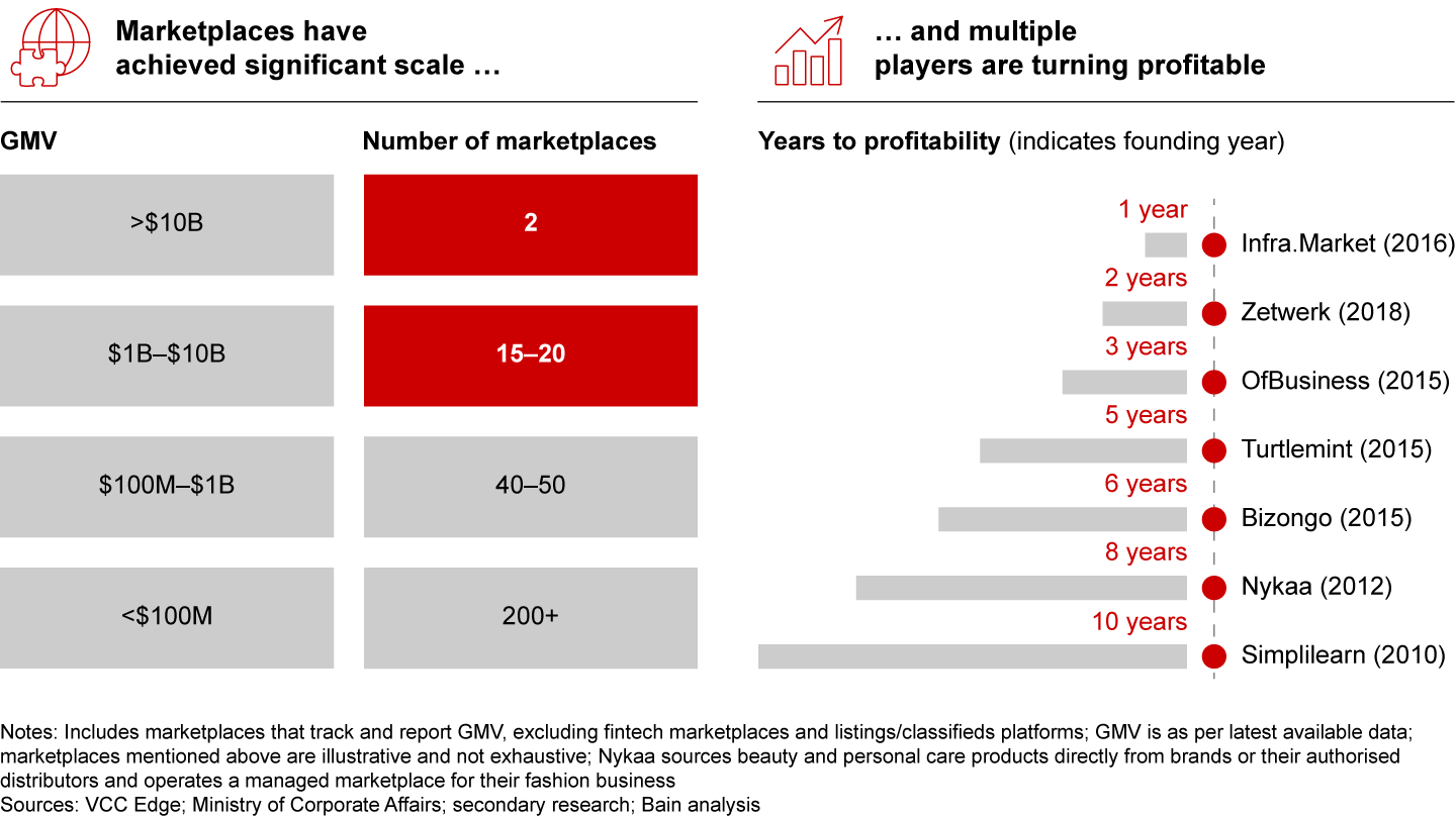 This has allowed India to cultivate a vibrant and successful marketplace landscape, demonstrated by the sheer breadth of more than 300 funded marketplaces across multiple categories (retail, education, healthcare, travel, financial services, etc.). As of today, around 20 marketplaces have achieved more than $1 billion in GMV, and many players have turned profitable.