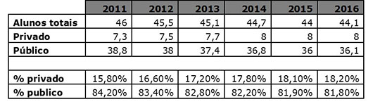 Evolução no número de alunos nos últimos anos, entre público e privado (em milhões)