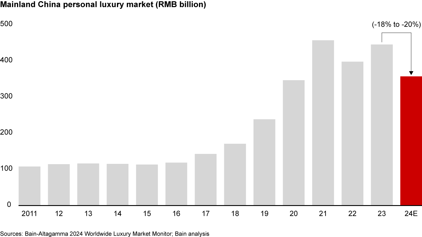 - In 2024, the Chinese mainland luxury market experienced a significant decline of 18%–20%, reverting to 2020 levels due to low consumer confidence and increased overseas spending. In many ways, this downturn marks the end of the Covid-19 artificial boost on the China luxury goods market as global tourism continues to recover.