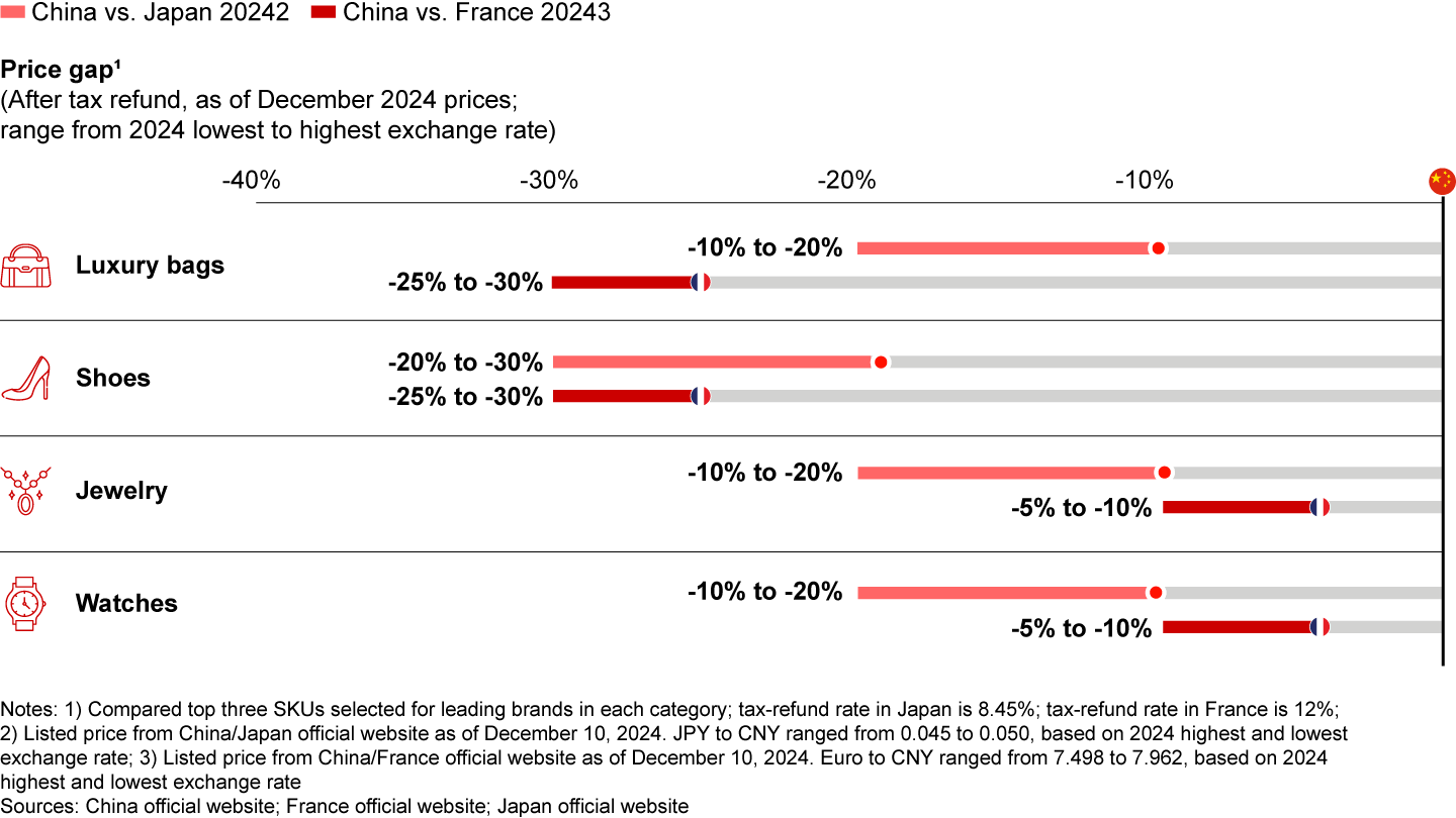 The pricing disparities between luxury goods on the Chinese mainland and other markets, particularly Japan, disrupted the mainland market and played a crucial role in the resurgence of overseas luxury shopping in 2024. A sample analysis of key products across the Chinese mainland, France, and Japan revealed significant price differences across various categories, making luxury shopping abroad even more appealing, especially under favorable exchange rates (see Figure 5). At the yen's lowest point versus the RMB, the price gap compared to domestic prices reached as much as 30%. These wide price gaps have further encouraged overseas shopping, particularly among price-sensitive consumers, which has negatively impacted brand loyalty and recruitment on the Chinese mainland.