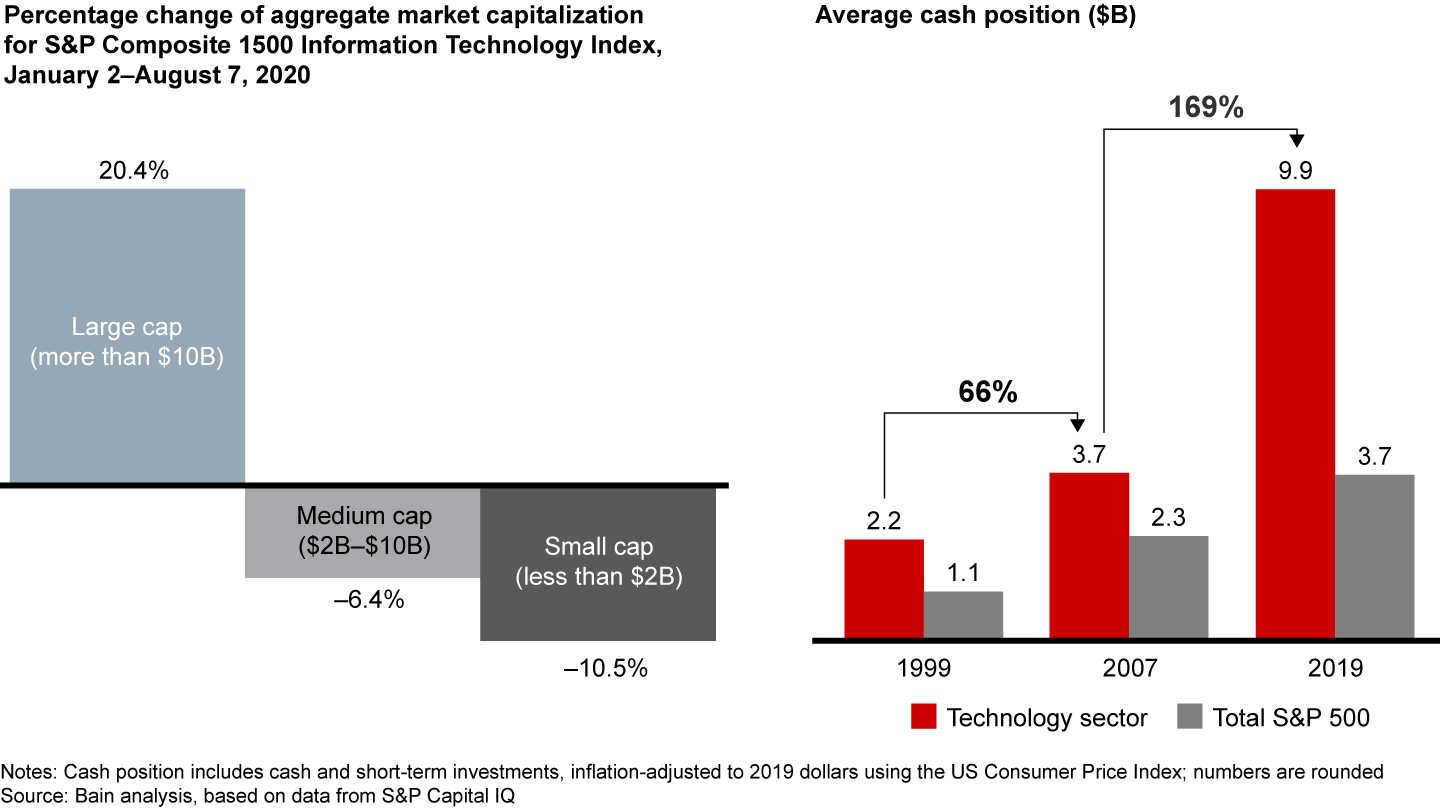 This scope M&A bent will likely accelerate. Technology deals came to a standstill in the second quarter of this year, due to the Covid-19 pandemic and tightening credit markets. But the landscape is ripe for renewed M&A activity. Many technology companies’ share prices have been resilient during the recent economic downturn, and they’re sitting on large cash reserves that could fund deals (see Figure 2). Those with the means will use this opportunity to add new capabilities and reposition their organizations for the postpandemic world.