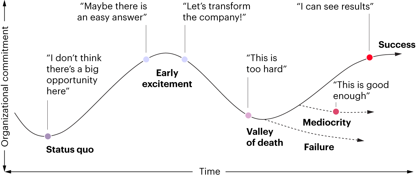 To better understand those challenges, we asked four transformation leaders what they found trickiest. Invariably they cite energy, both generating and maintaining it. This matches our experience that organizational energy is the resource that most often limits the rate of transformation. Energy needs to be cultivated and managed.