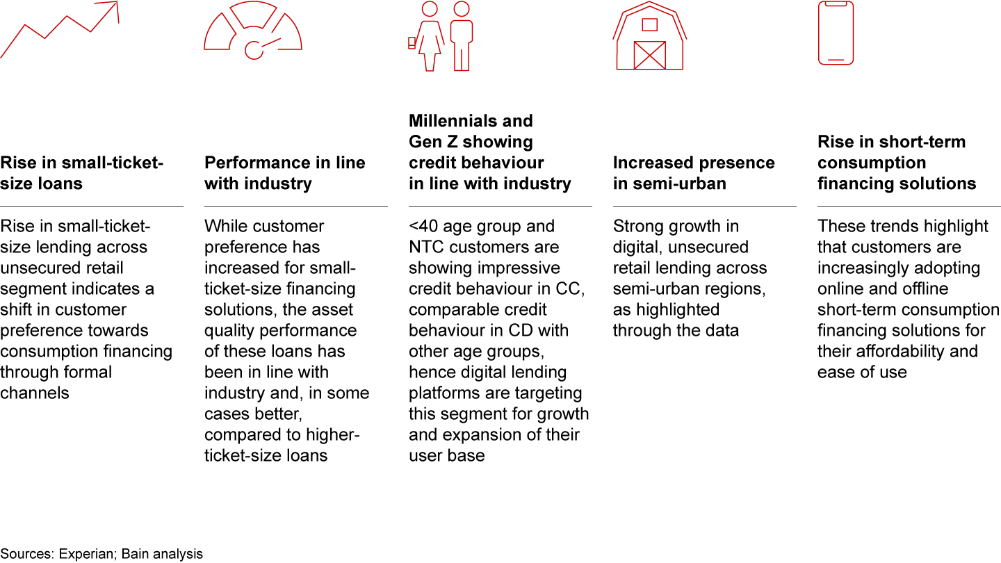 • The above factors highlight a clear trend in favour of bite-sized consumption financing solutions, especially driven by millennials and Gen Z. Growth in semi-urban regions and in the NTC segment also shows that lenders are beginning to successfully increase their reach through digital channels and leverage alternate data for underwriting.