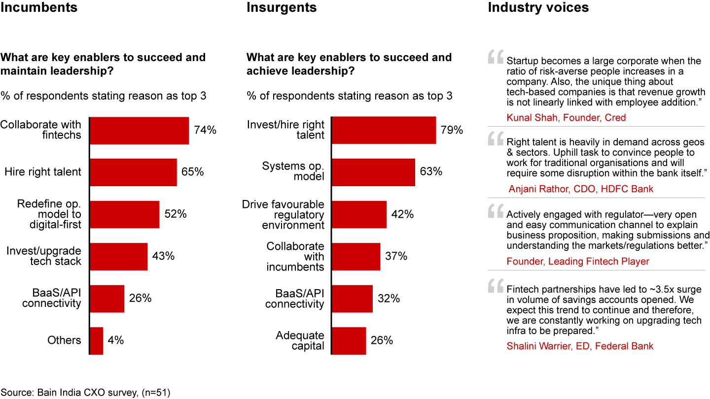 - About 75% of incumbents have highlighted collaboration with fintechs as the most critical enabler for maintaining leadership in digital FS. Acquiring and retaining the right talent (data scientists, product owners, developers, designers, enterprise architects, etc.) has emerged as a critical enabler for both incumbents (65%) and insurgents (79%).
