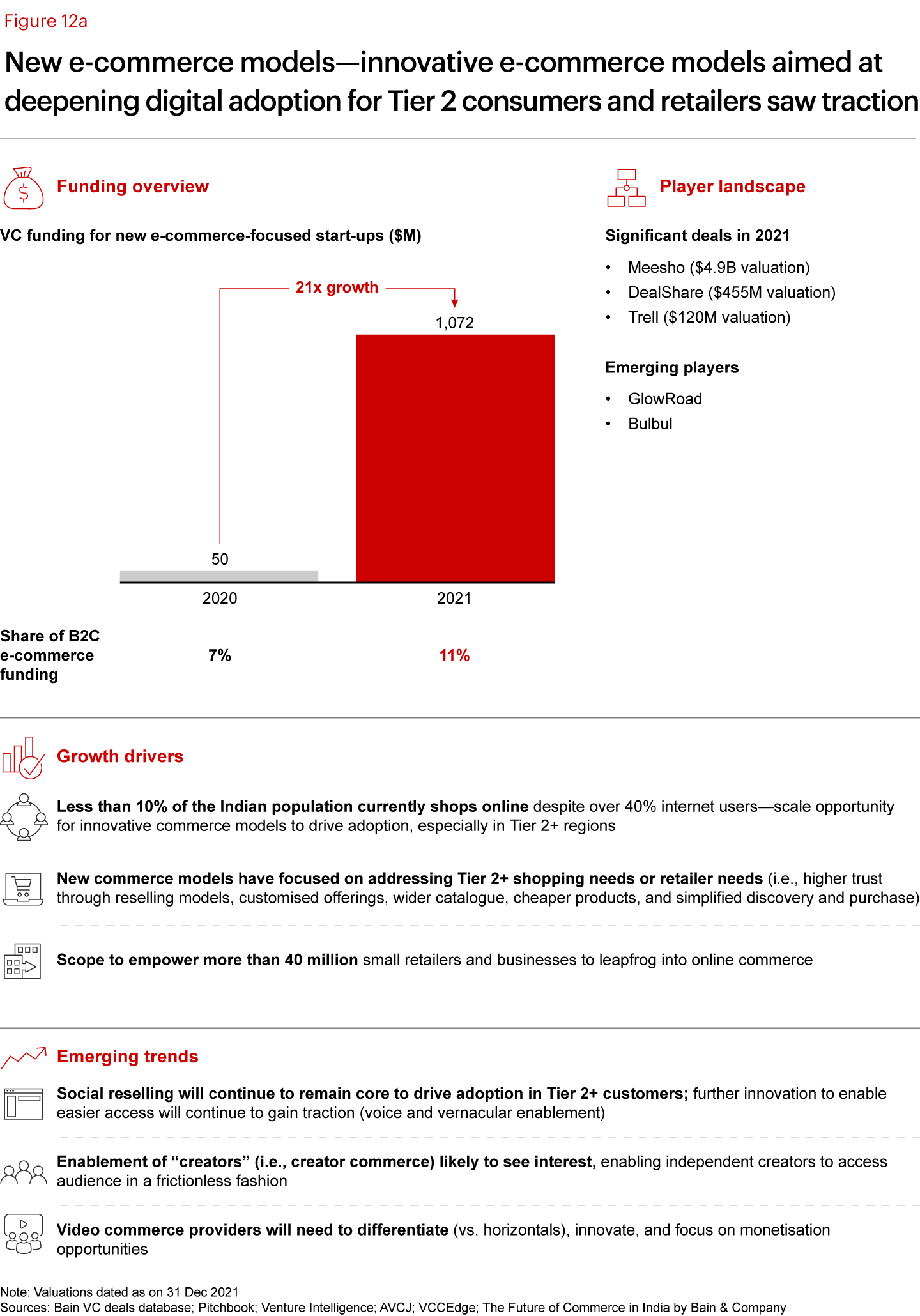 - Online business-to-business (B2B) marketplaces saw traction as four new unicorns were created—large opportunity size driven by the pandemic-led inflection in digital adoption within B2B supply chains