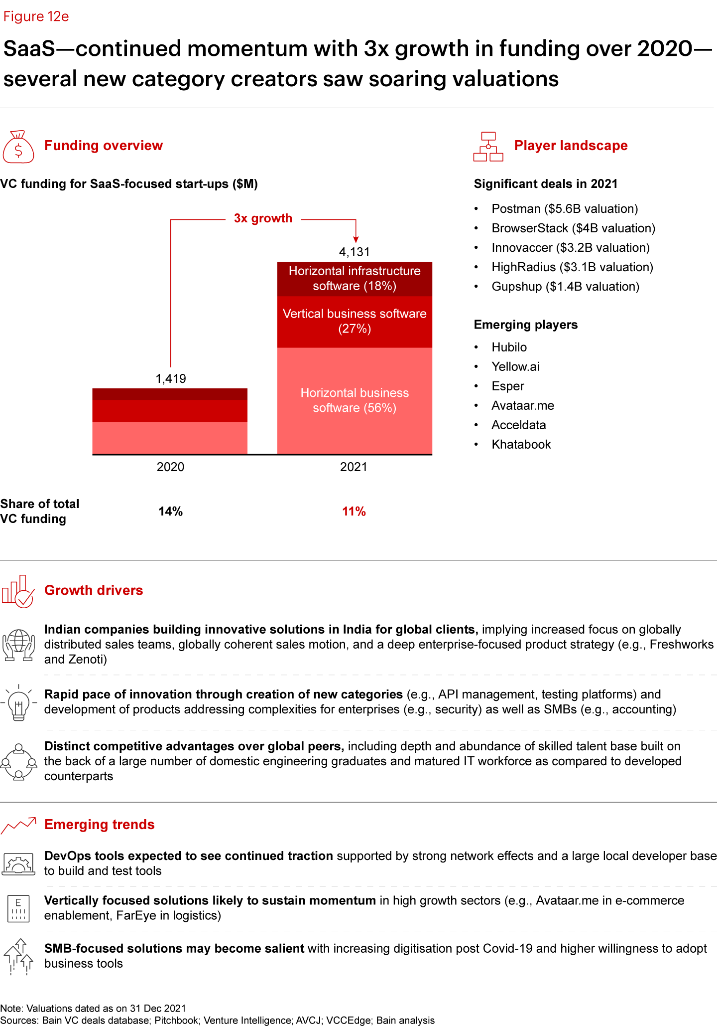 - Investing momentum in India was driven by a pivotal convergence of tailwinds. Digital infrastructural fundamentals (e.g., cheap data access, UPI, eKYC via Aadhar) opened enormous economic opportunities that are increasingly being addressed by the deepening start-up ecosystem in India. Investor confidence was also reinvigorated by a record year of exits, especially as public listings gained momentum. Regulatory crackdowns in China on tech firms created further uncertainty, driving some degree of capital flight to India