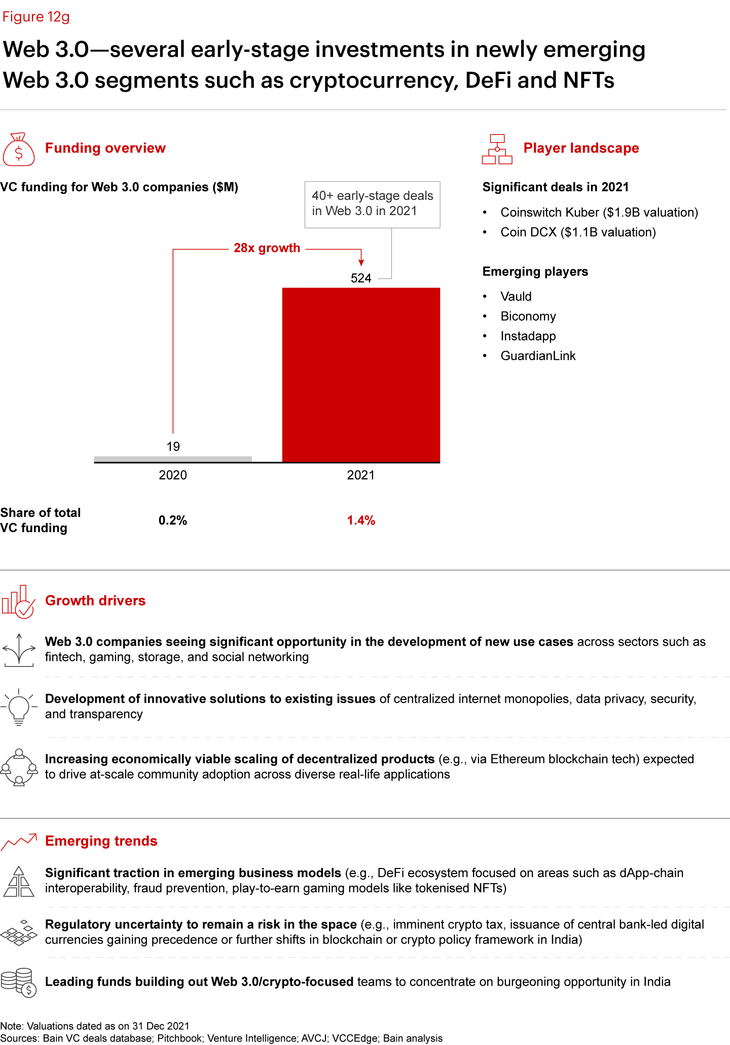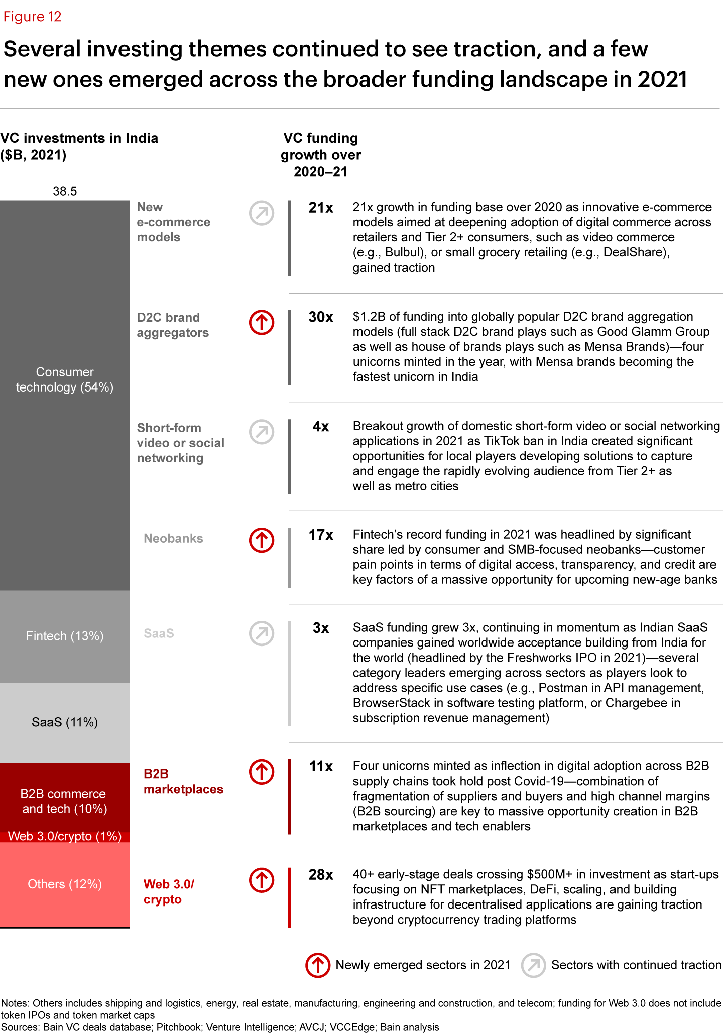 - Three sectors (consumer technology, fintech, and SaaS) continued to account for 75%+ of all VC investments by value, in line with 2020; however, 2021 was differentiated in terms of a sharp rise in investments in emerging technologies, such as B2B commerce and tech (6.6x growth over 2020) and Web 3.0 or crypto based start-ups (~28x growth over 2020 reaching $500M+ in investments)