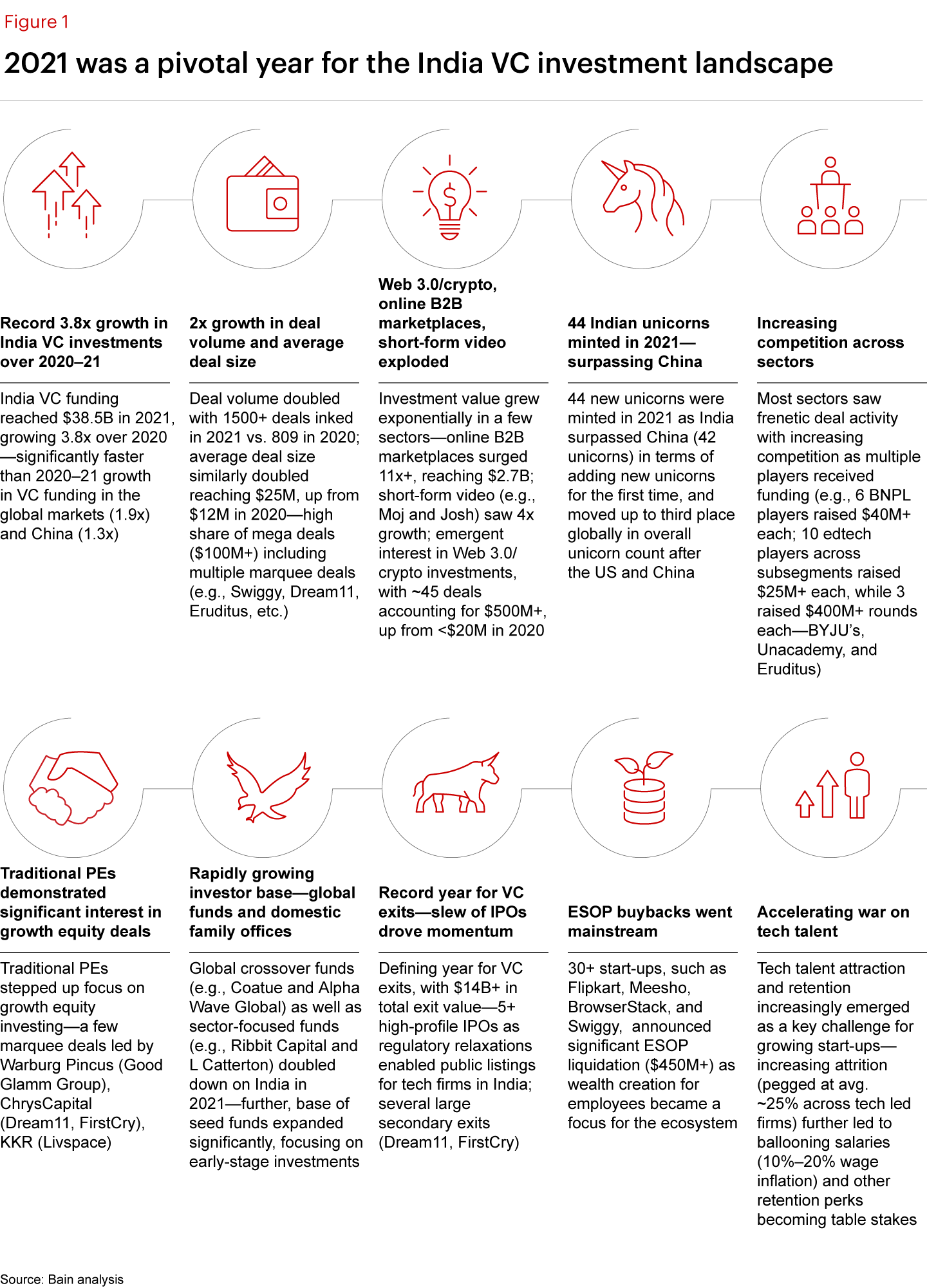 2021 was a pivotal year for the Indian venture capital (VC) investment landscape—a convergence of heady tailwinds coming together in a record growth year as VC funding reached $38.5B with several highlights:
