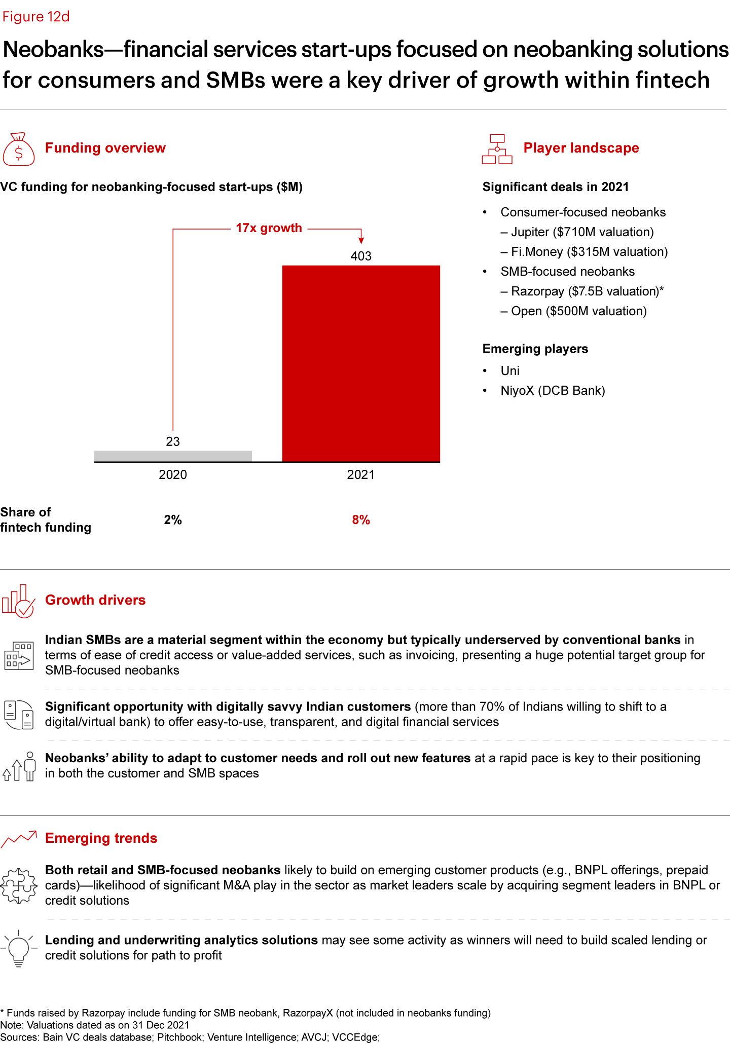 Investing momentum was driven by a significant confluence of factors that were several years in the making: maturing digital infrastructure (Unified Payment Interface [UPI]-led payment rails, cheap and ubiquitous data access and Aadhar electronic Know Your Customer [eKYC]), increasing depth in the start-up ecosystem and reinvigorated investor confidence as long-held capital saw significant public and secondary exits, and a positive macroeconomic outlook for India. Further, as Chinese regulators tightened control over the local tech economy (fintech and edtech), capital deployment saw redirection to India.