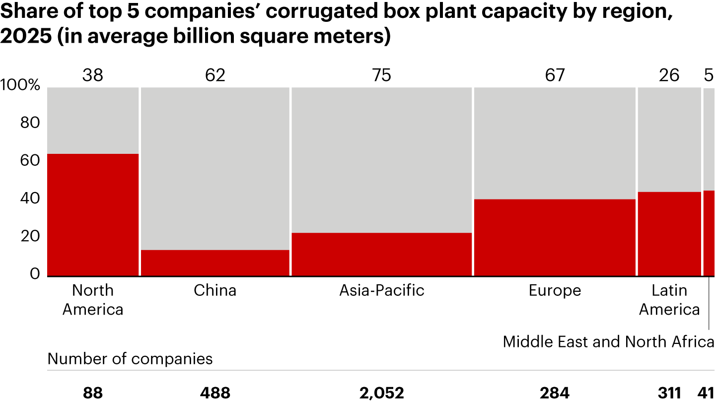 Going forward, Europe still has room for further consolidation, yet two factors make this process more complex: shareholder structures (e.g., family-owned businesses and foundations) and the nature of packaging conglomerates. In contrast, North America has less headroom for consolidation (but still some) within similar segments of the value chain. As such, there is a greater expectation for more consolidation to happen downstream in packaging, and converting will likely continue, especially in areas such as containerboard and flexible packaging.
