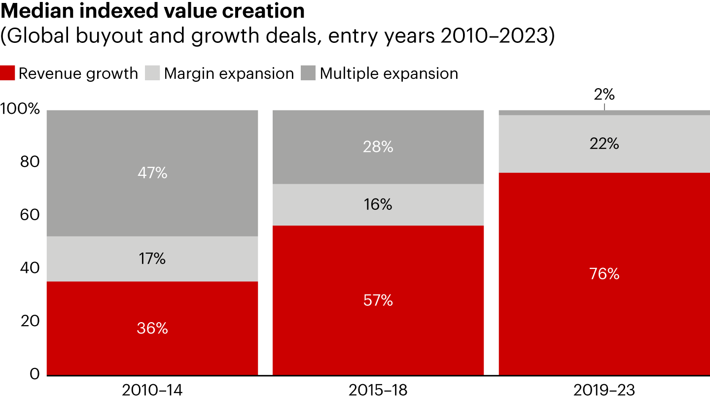 Notes: All calculations in US dollars; deal universe includes fully and partially realized packaging deals with initial investments in 2010–2023 globally; all equity check sizes; buyout and growth; sums may not add up due to rounding; margin expansion refers to an increase in profitability through improving a company’s efficiency and cost management; multiple expansion generally refers to the increase in a company’s valuation from the time it was acquired and then sold