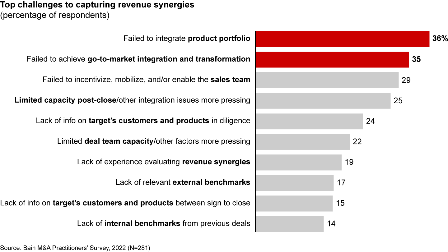 The trouble is that revenue synergies are difficult to size and to realize. In fact, overestimating revenue synergies was the most-cited reason for unsuccessful deals in Bain’s recent survey of 281 executives.