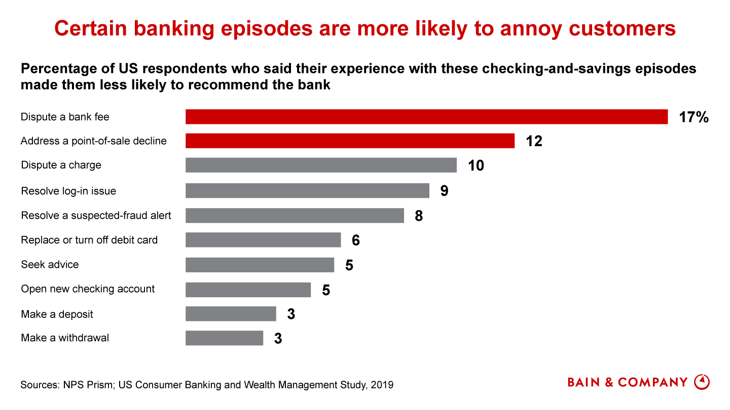 Analysis of data from Bain’s NPS Prism℠ benchmarking tool—which compares consumer perceptions of competing banks at the detailed level of an individual episode—shows that certain episodes, such as disputing a fee, tend to annoy customers and often require human channels, making them more costly.