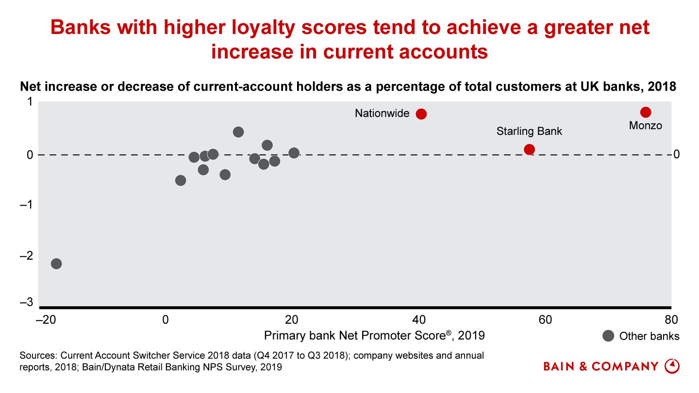 Loyalty-leading banks have dramatically fewer of these episodes, the NPS Prism survey finds. Moreover, customers of the loyalty leader in a market are more likely than those of the loyalty laggard to use digital channels first, more likely to resolve an issue at first contact, and less likely to have the digital channel fail to resolve the issue. All these conditions lead to higher loyalty and lower cost. Loyalty also helps to increase revenue: In the UK, for instance, banks with higher Net Promoter Score® attract more customers for current (checking) accounts, on net.