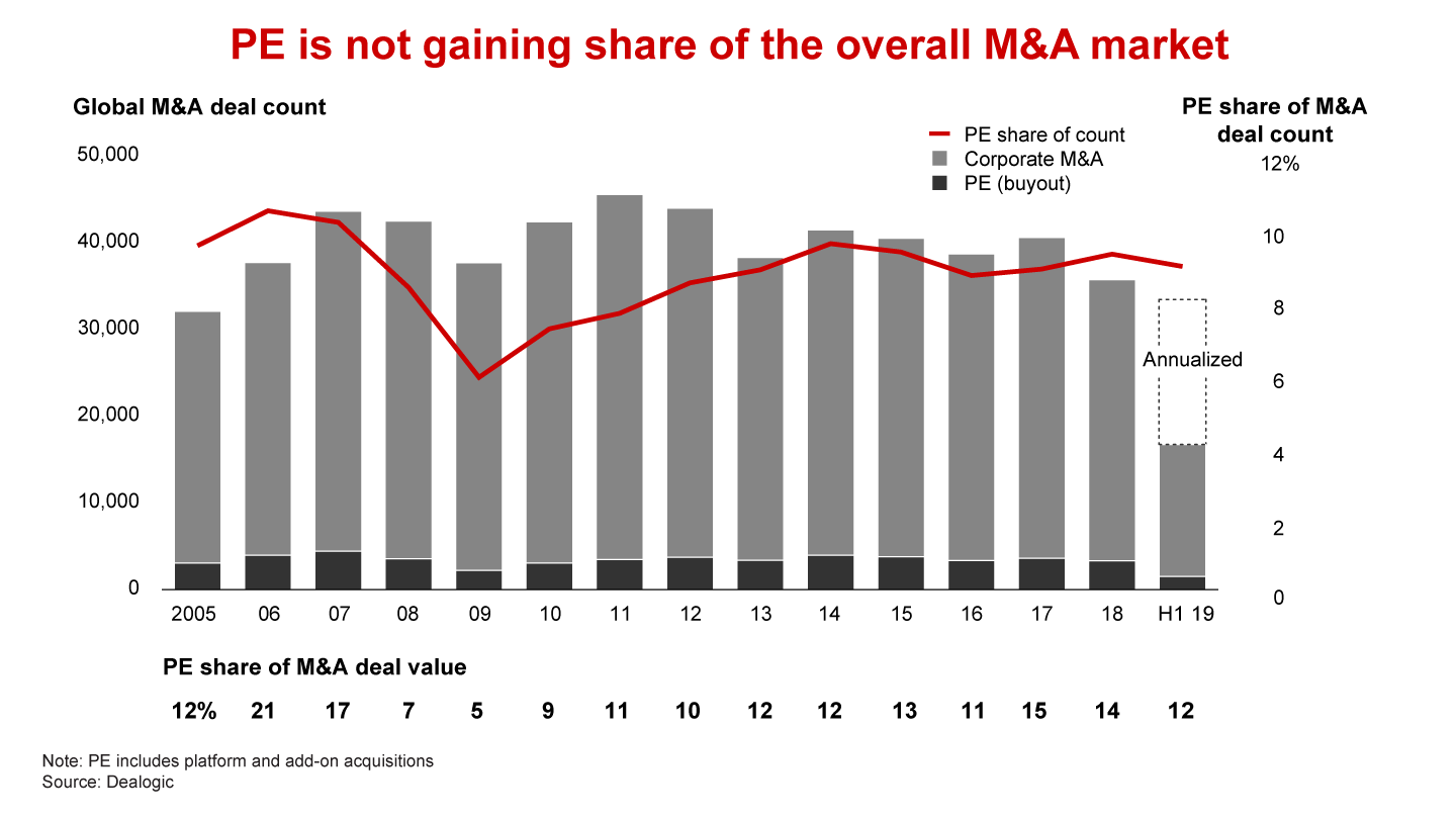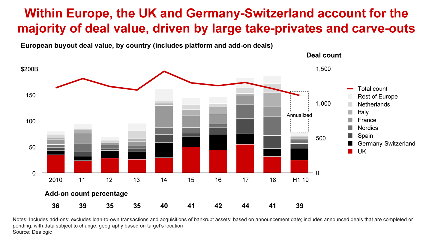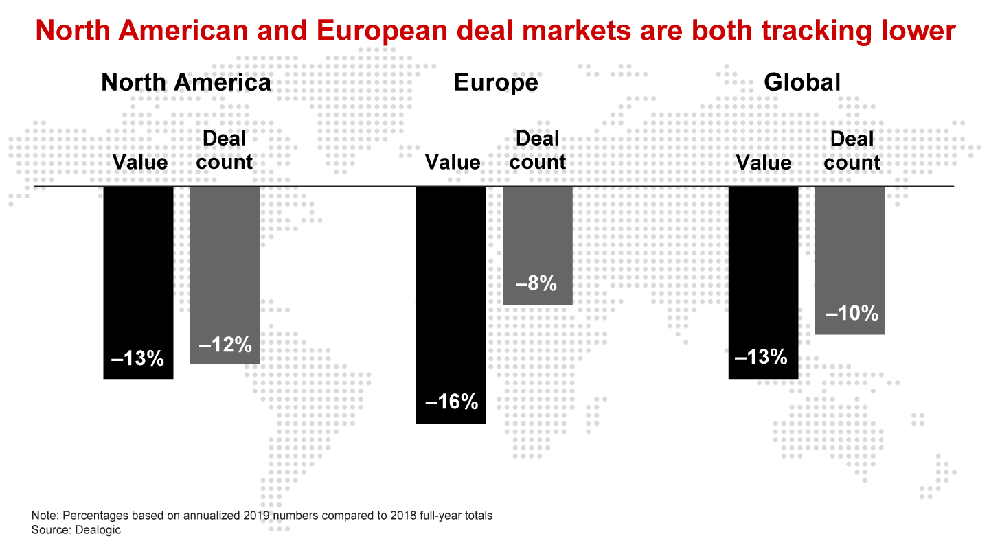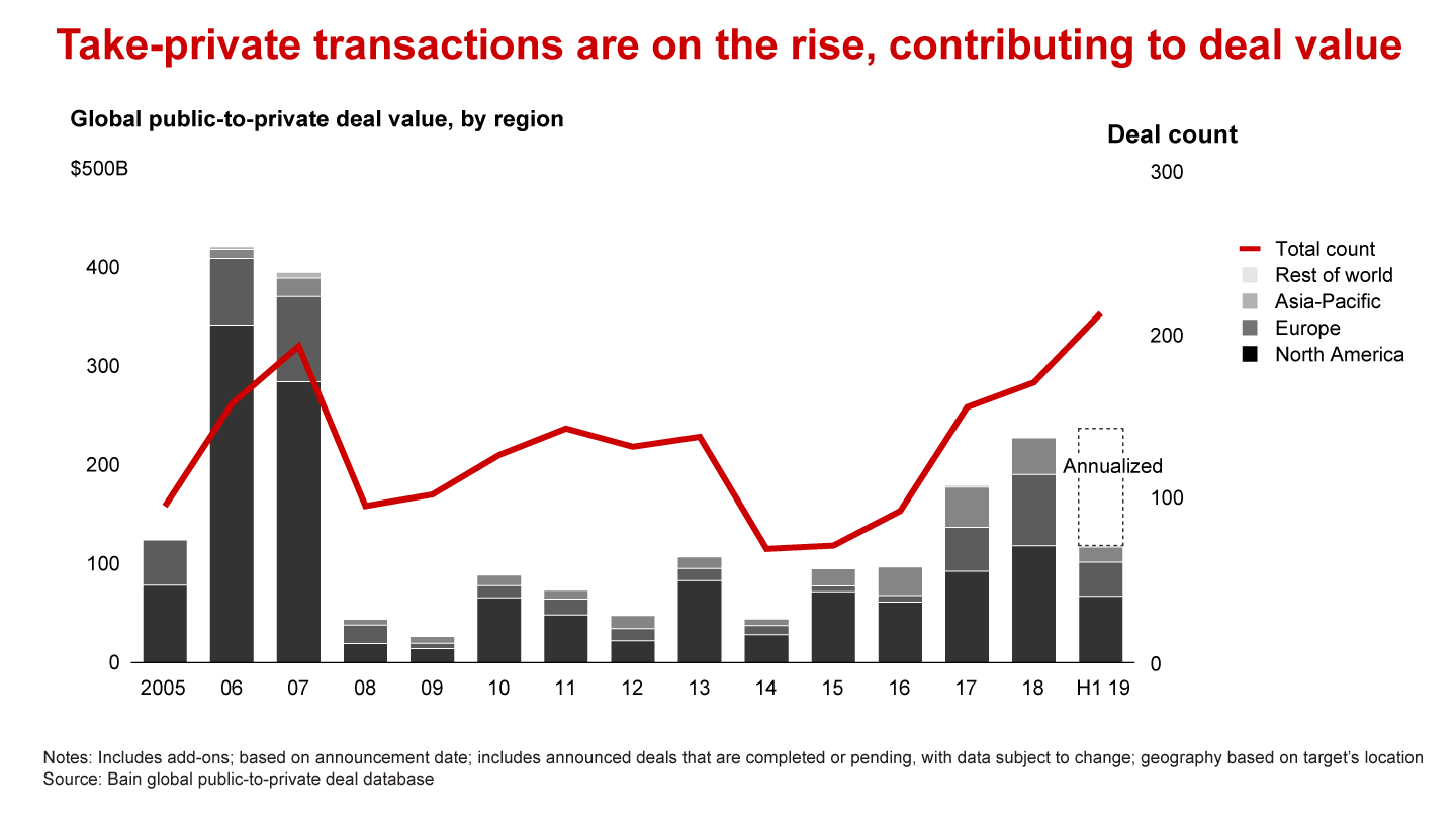 While overall deals are down slightly, take-private transactions are the exception. Recent big deal announcements in Europe (for example, Axel Springer and Merlin Entertainments) and the US (for example, Ultimate Software) put 2019 on pace to hit a record number of public-to-private transactions for the industry, surpassing even the boom years of 2006 and 2007.