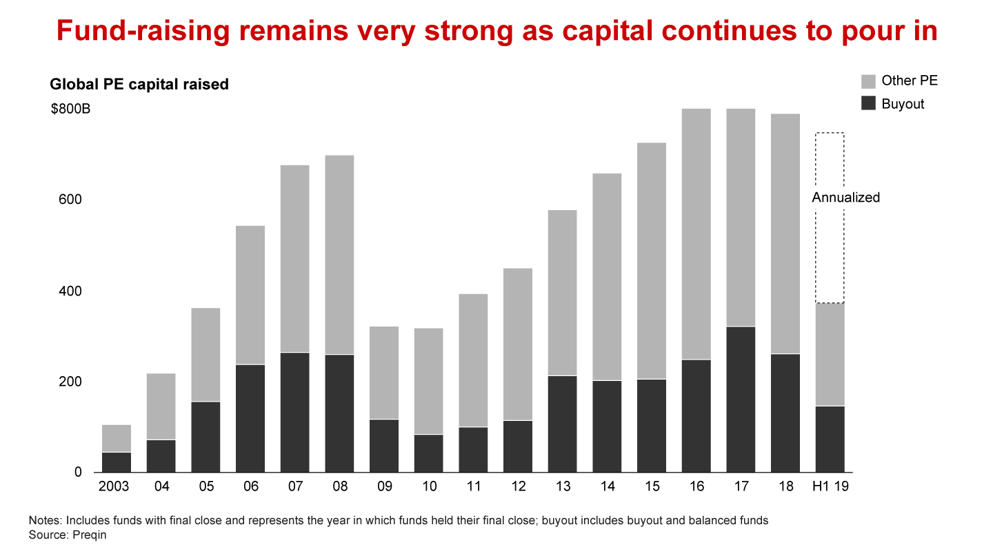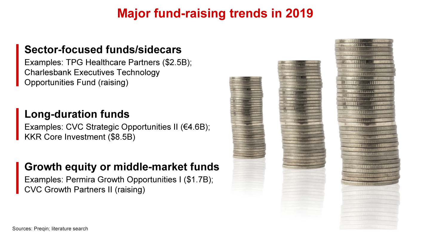At the same time, fund-raising continues unabated, with private equity firms taking advantage of the opportunity to launch new funds. Traditional buyout firms continue to push into different flavors of equity products, such as long-duration buyout funds, sector-focused funds, growth equity and middle-market.