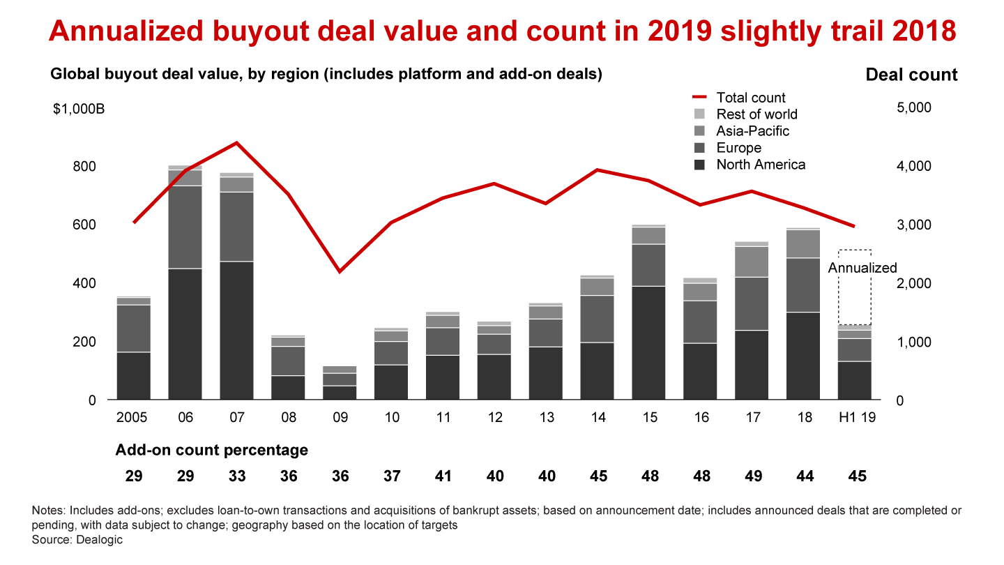 Halfway through 2019, private equity deal markets around the world are tracking slightly lower in both the number and value of the deals than a year ago. Two forces account for this dip, according to Bain’s analysis. The first of these are variety of macroeconomic and geopolitical forces. Deal count in the UK, for example, is down substantially thanks to the looming shadow of Brexit. And the second challenge private equity funds face is a familiar one: competing with corporate buyers in a hot merger market.